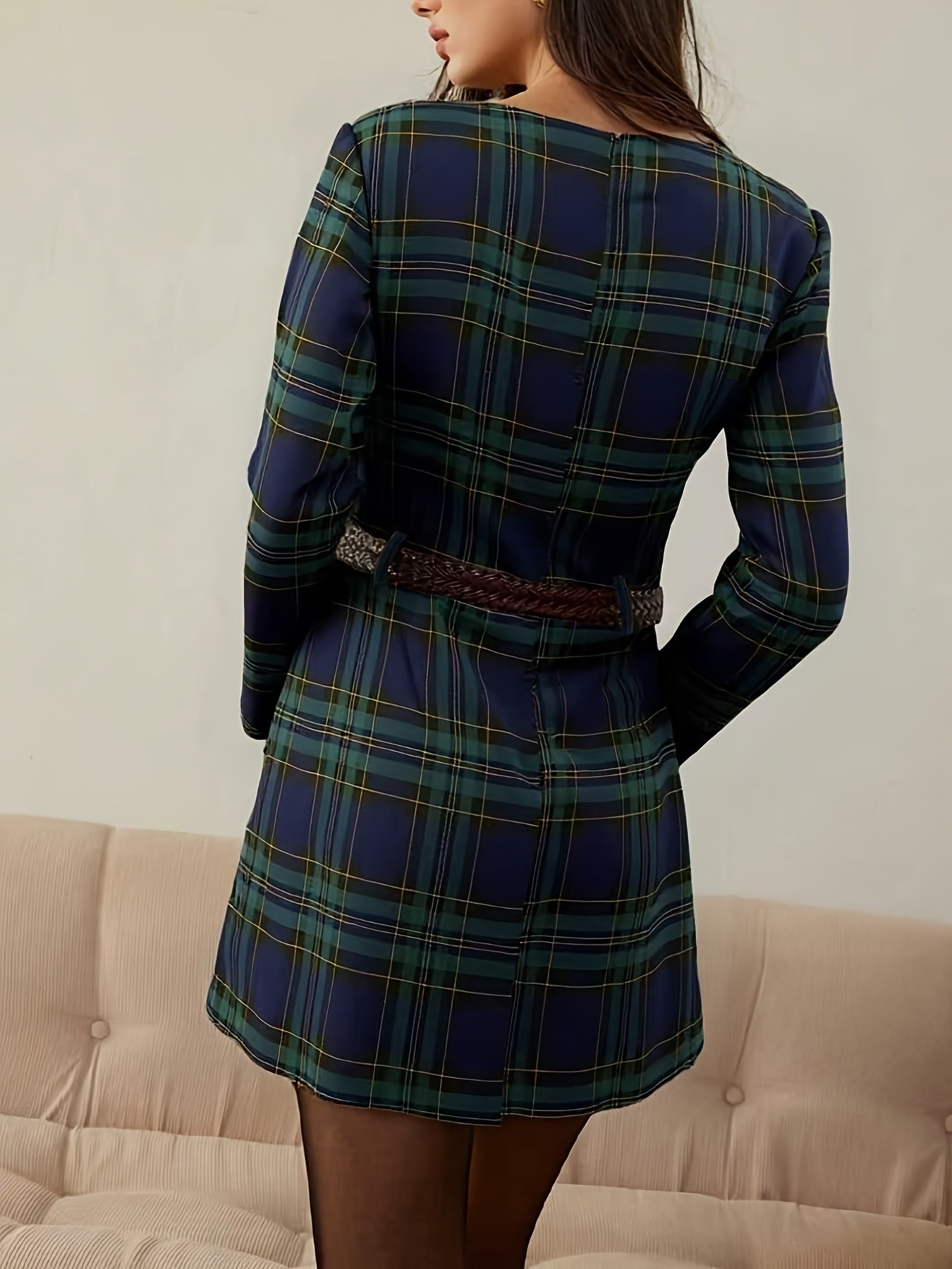 Plaid Print Long Sleeve A-Line Dress
