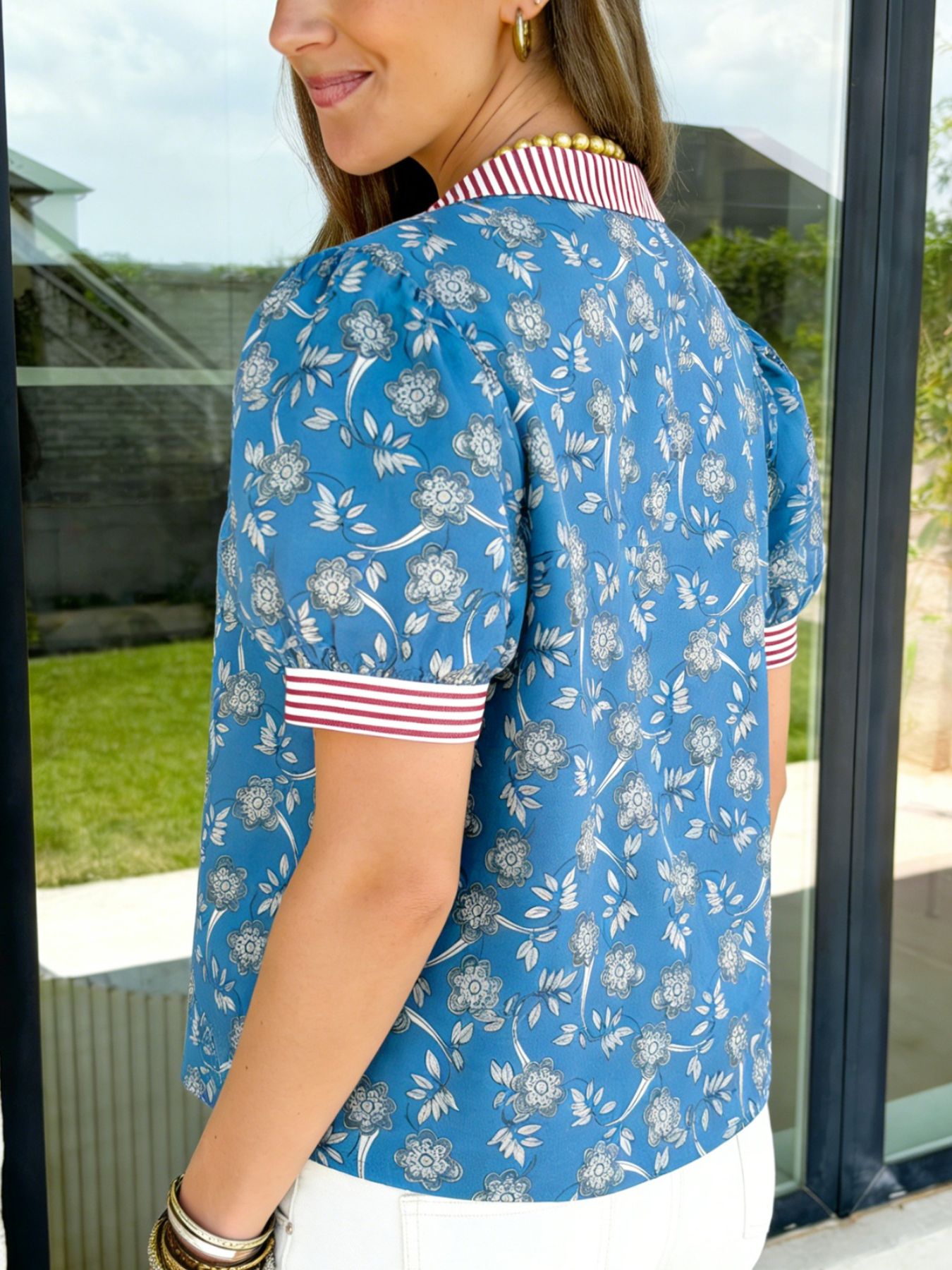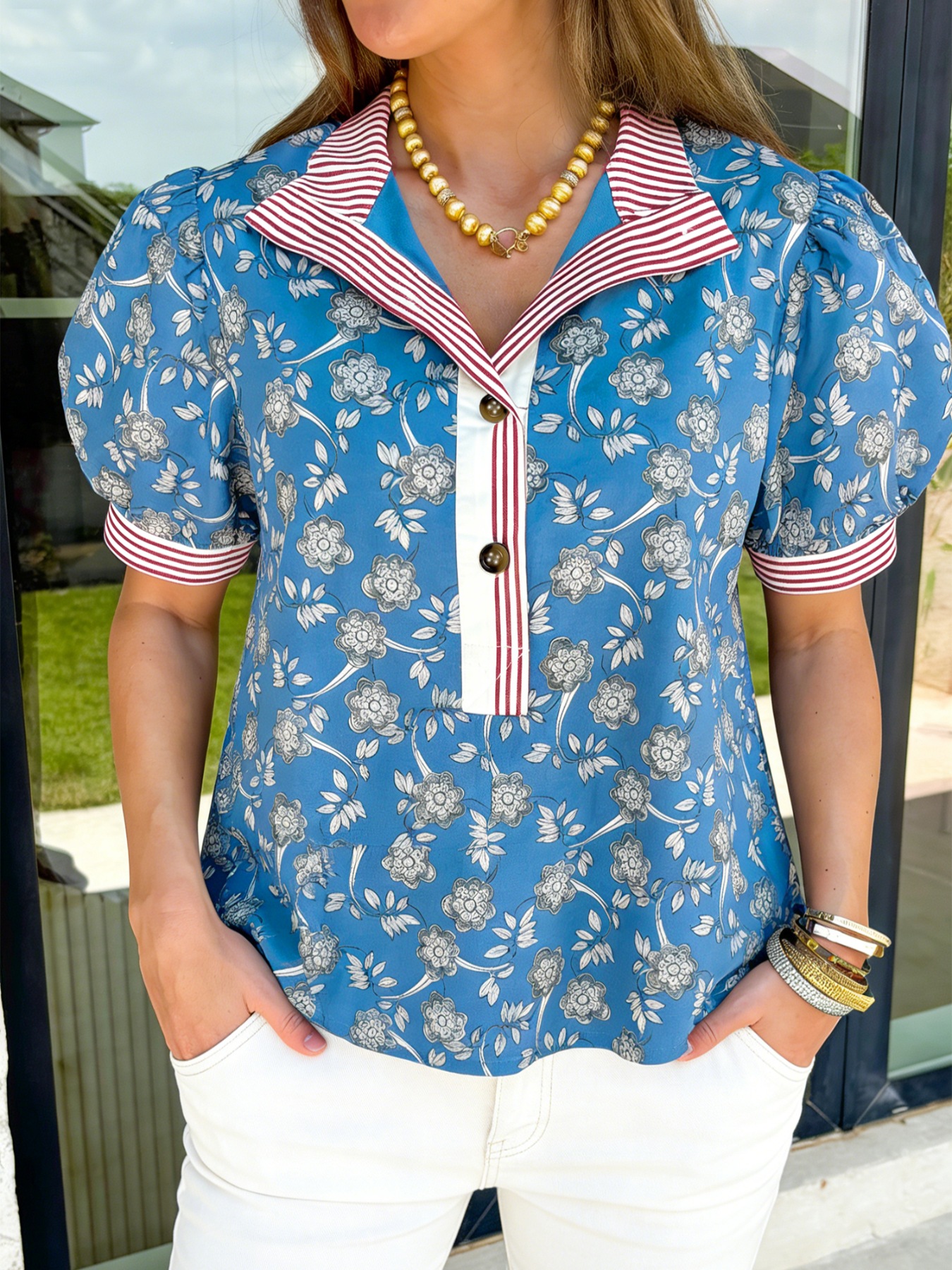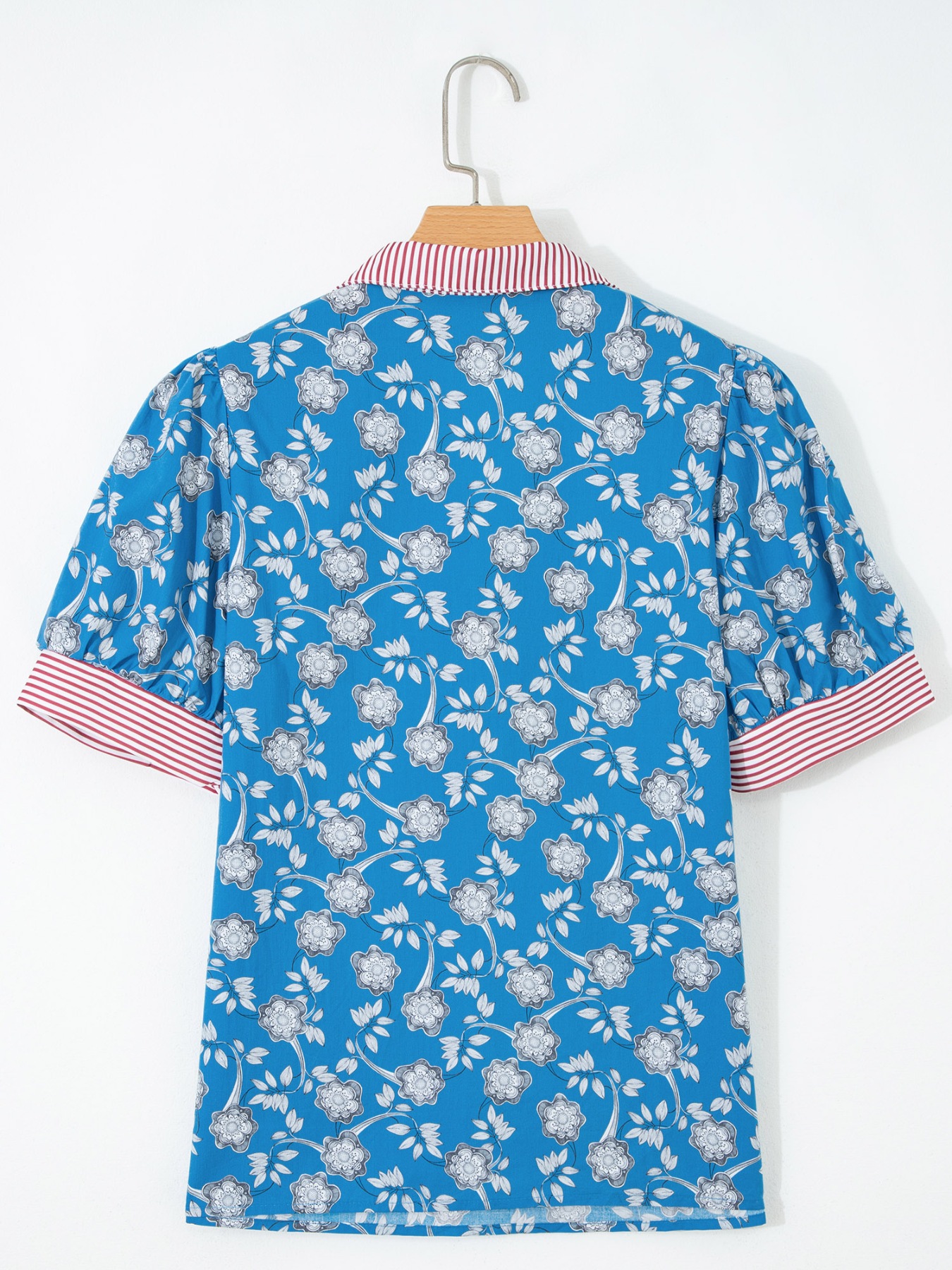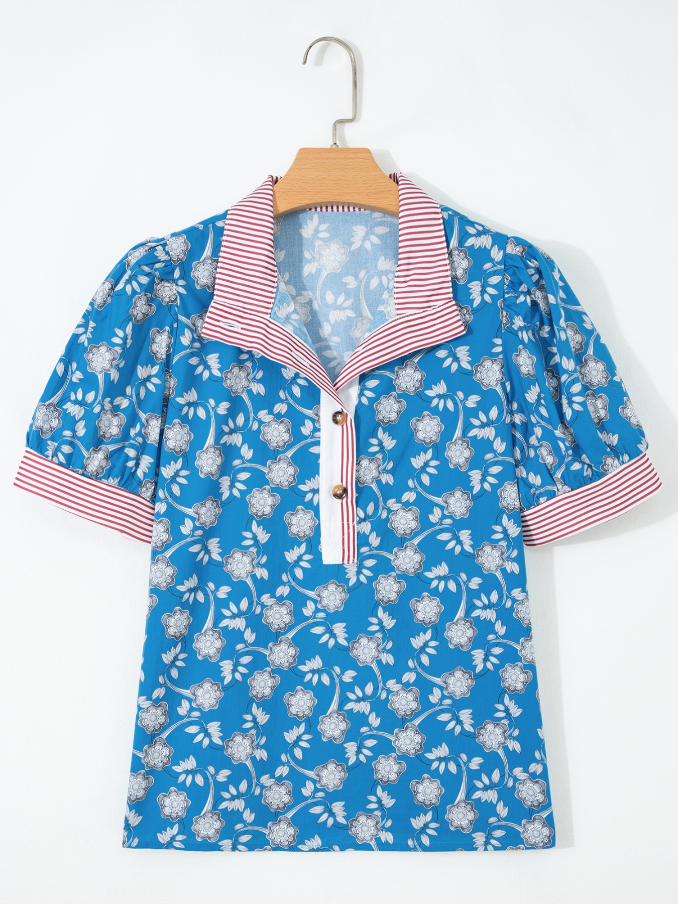 Floral Print Striped Trim Button Neck Short Sleeve Blouse