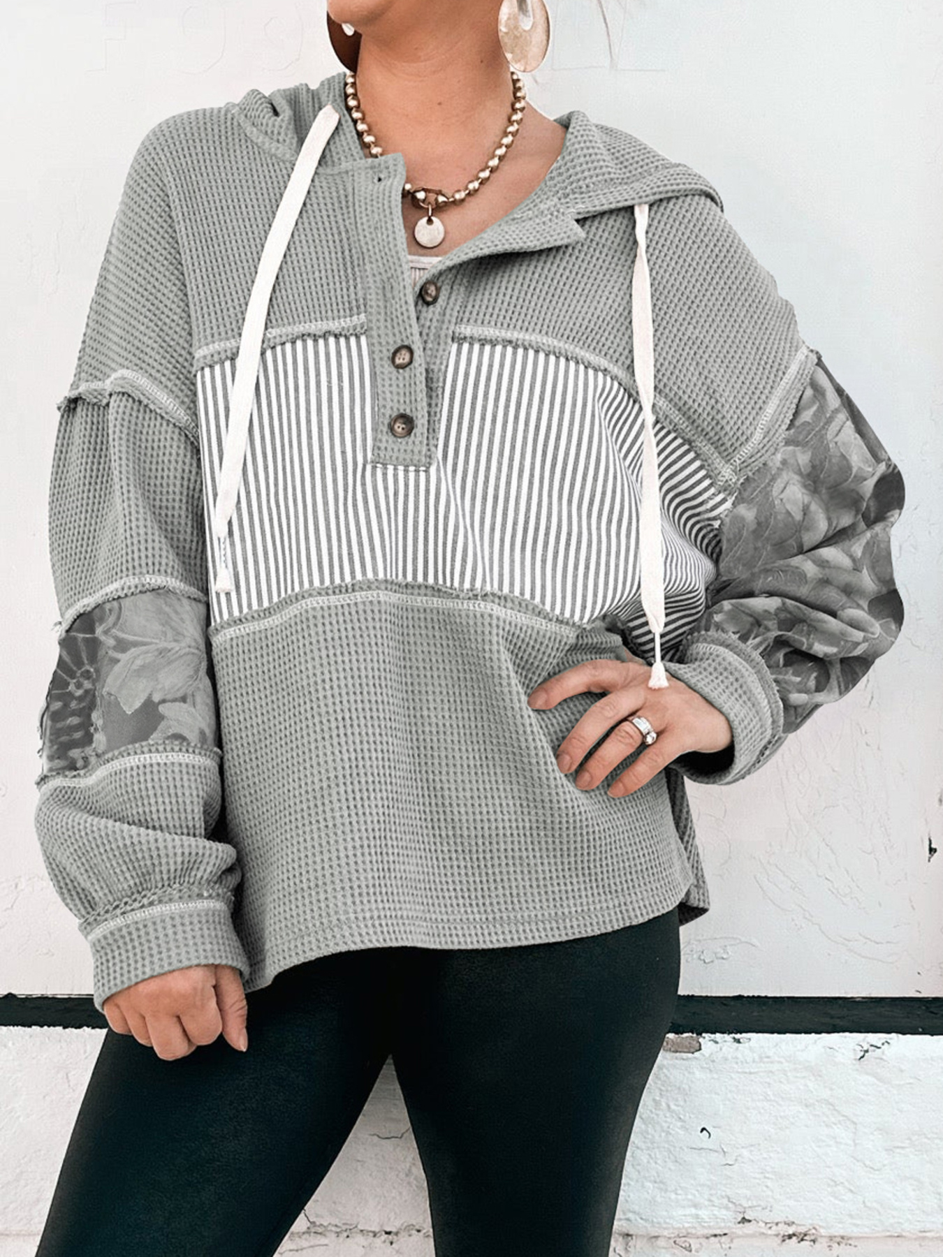Waffle Knit Striped Drawstring Hoodie