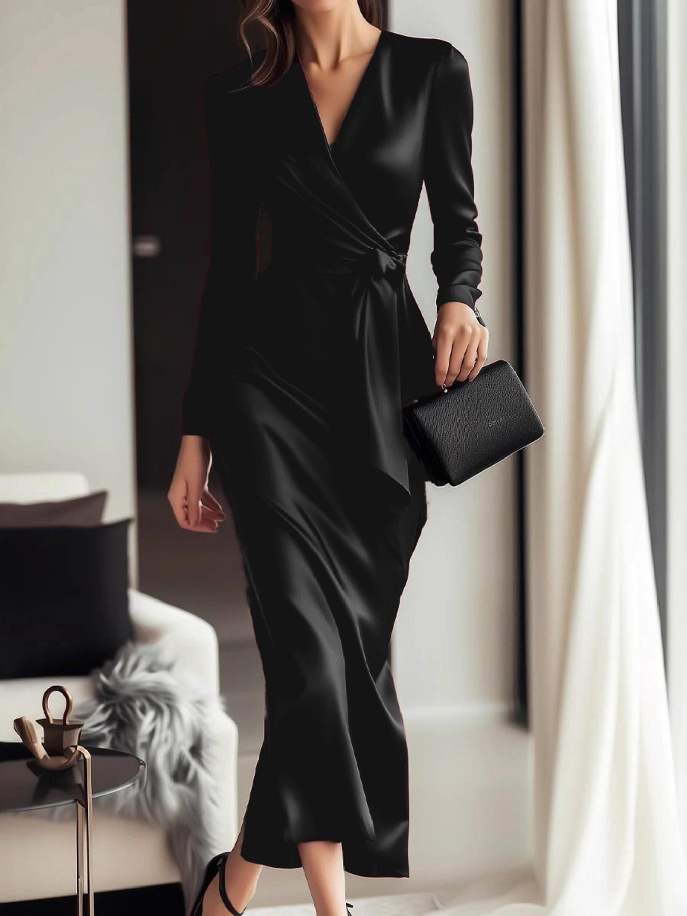 Satin Wrap Long Sleeve Midi Dress