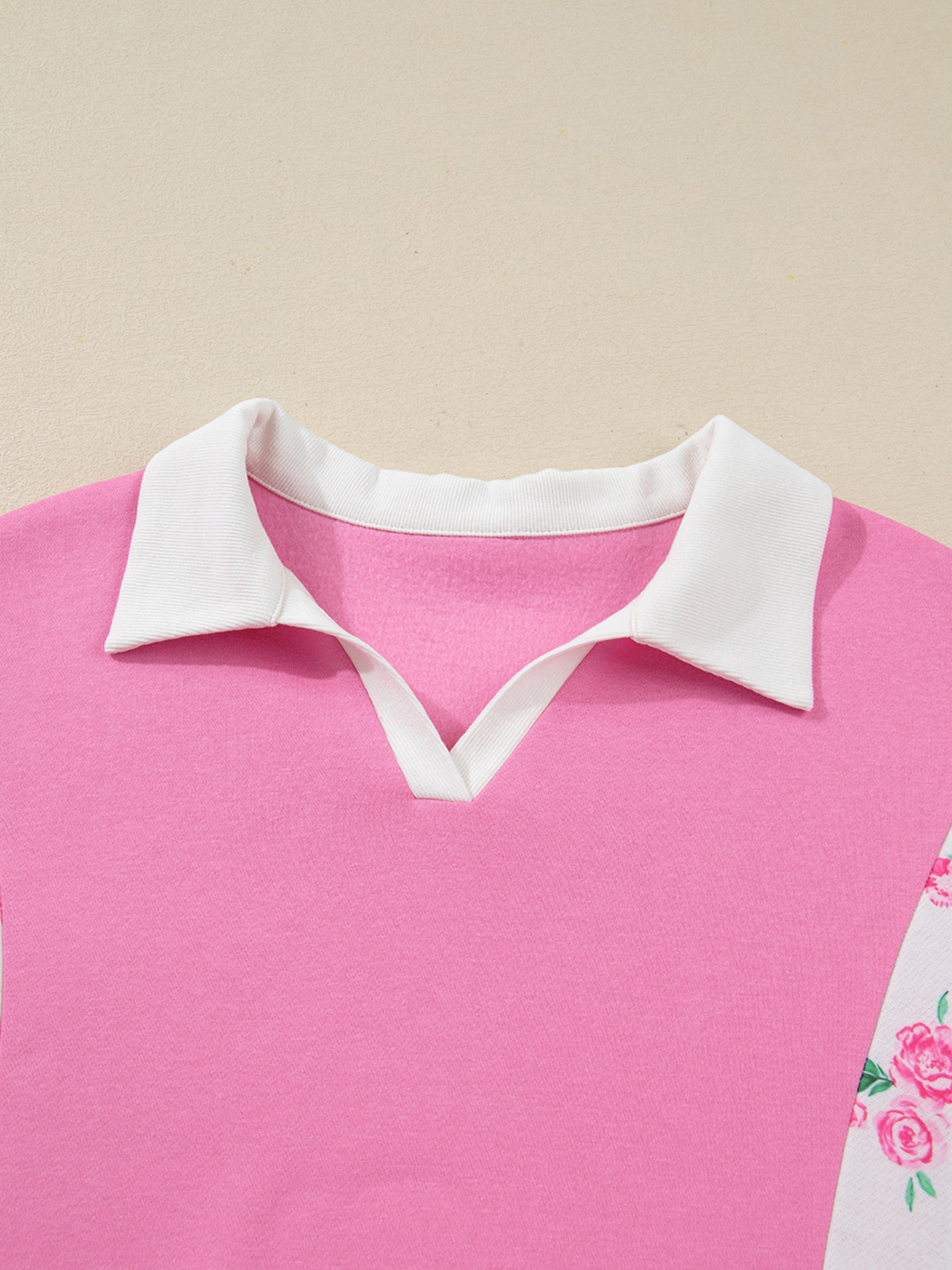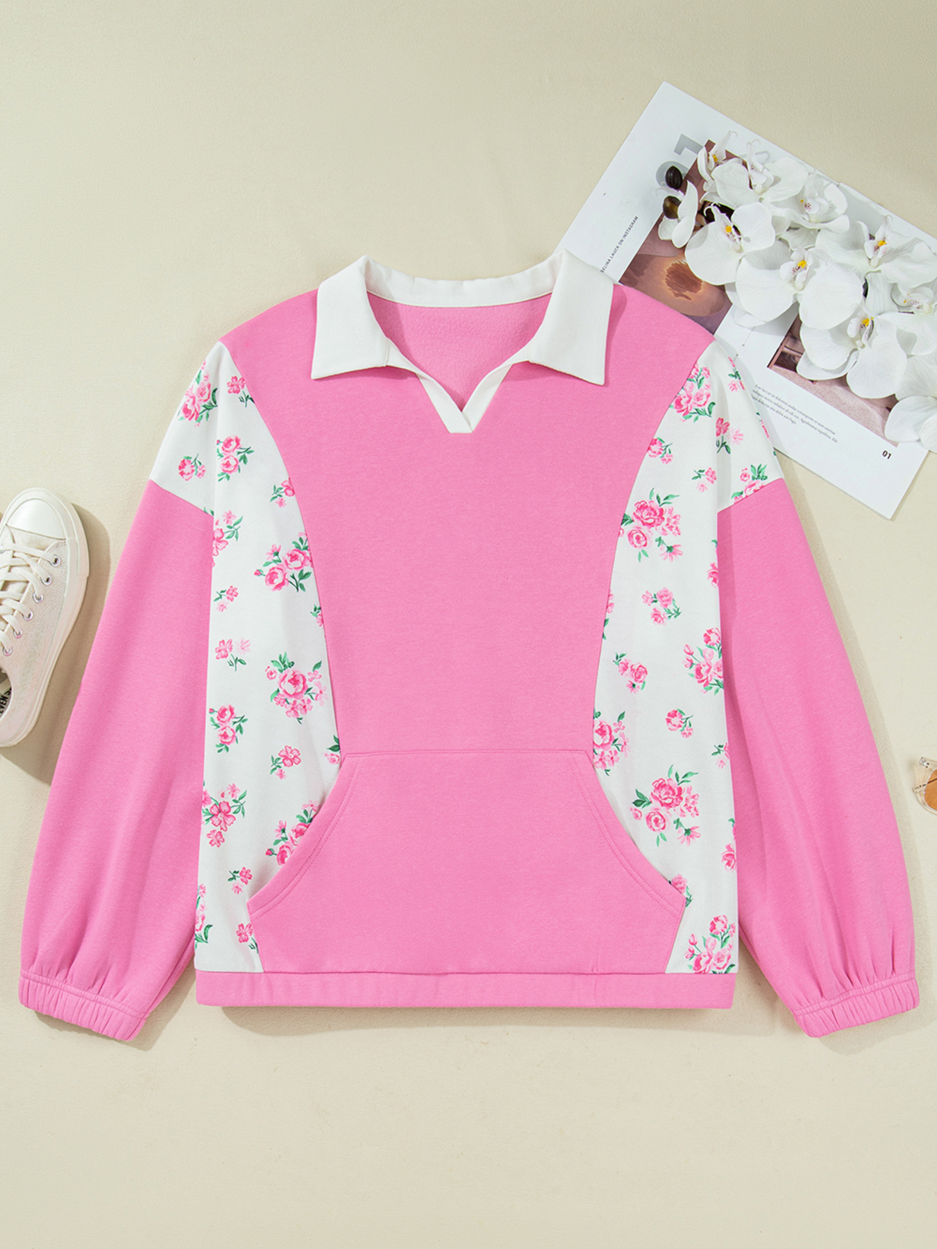 Plus Size Contrast Polo Collar Floral Patchwork Elastic Cuffs Long Sleeve Top