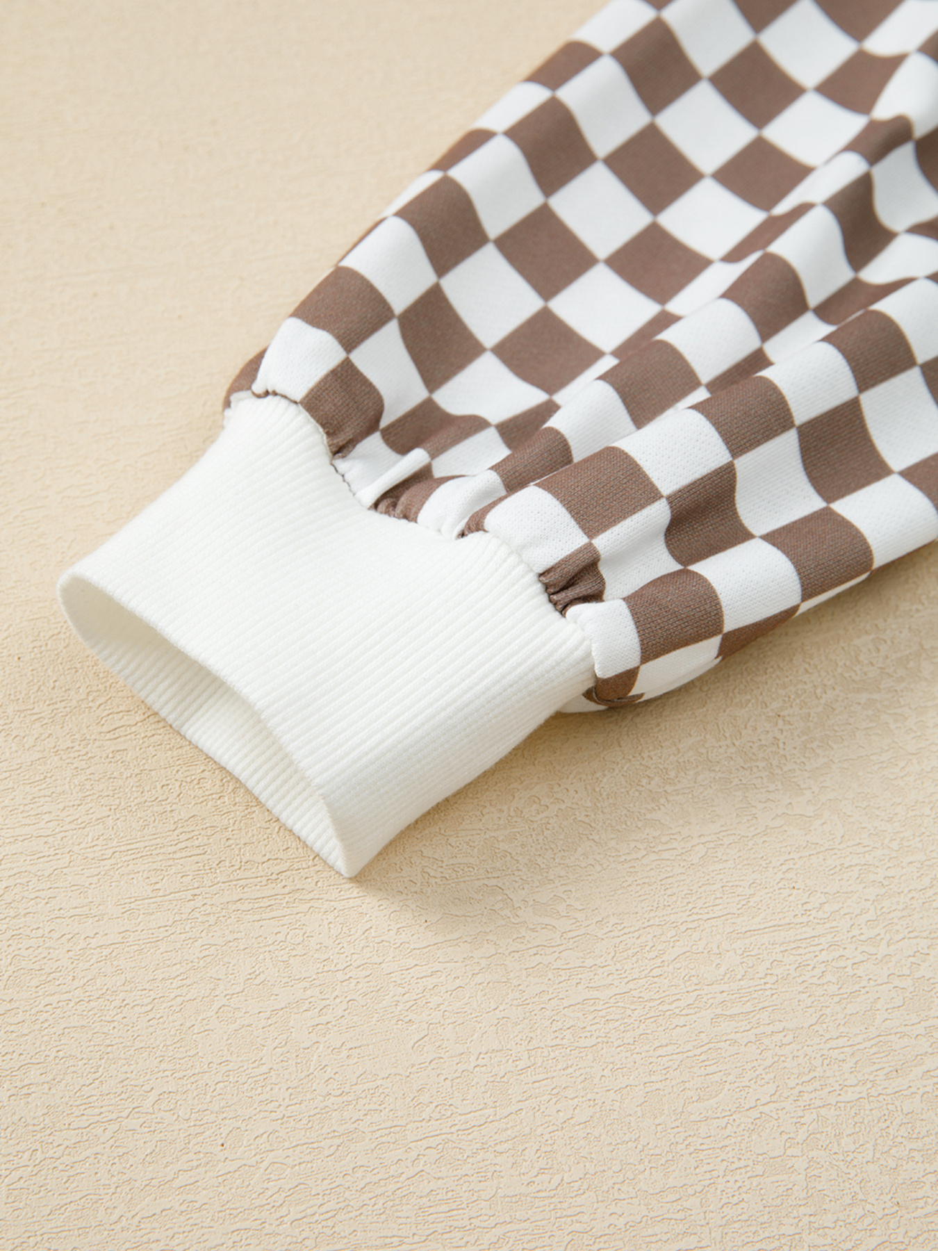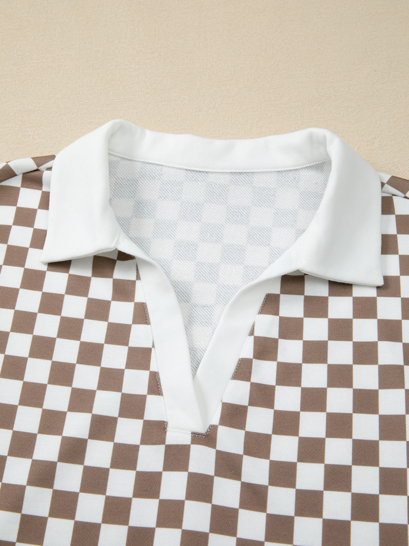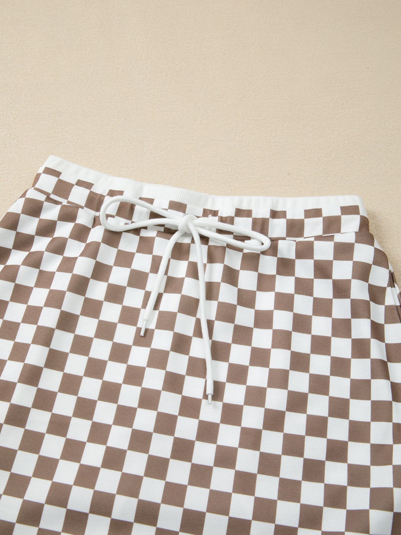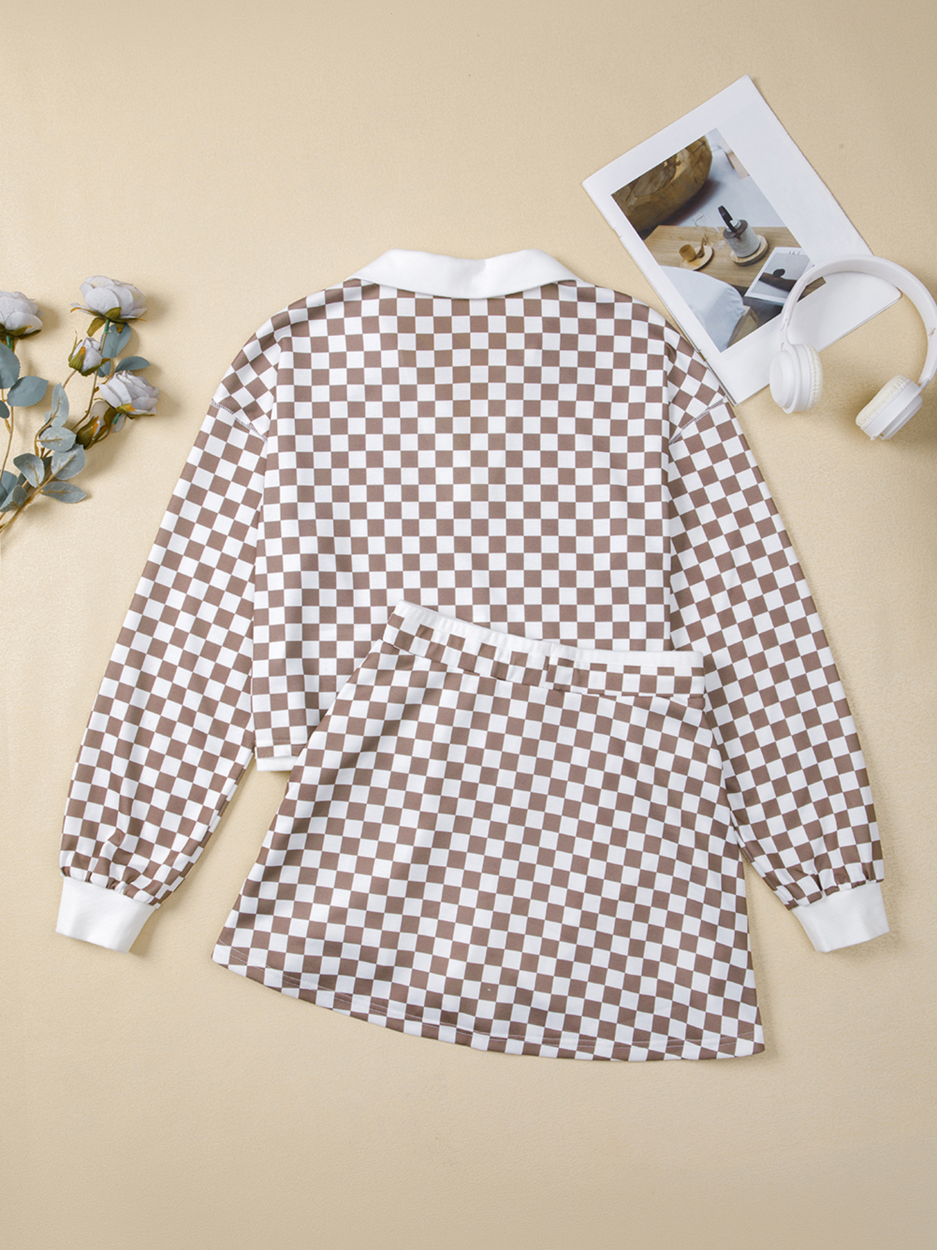 Checkered Print Polo Collar Cropped Long Sleeve Top And Drawstring Mini Skirt Set