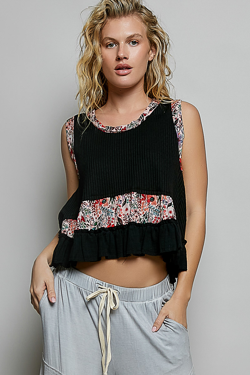 Pol Floral Print Patche Round Neck Ribbed Tank With Double Gauze Ruffle Accents